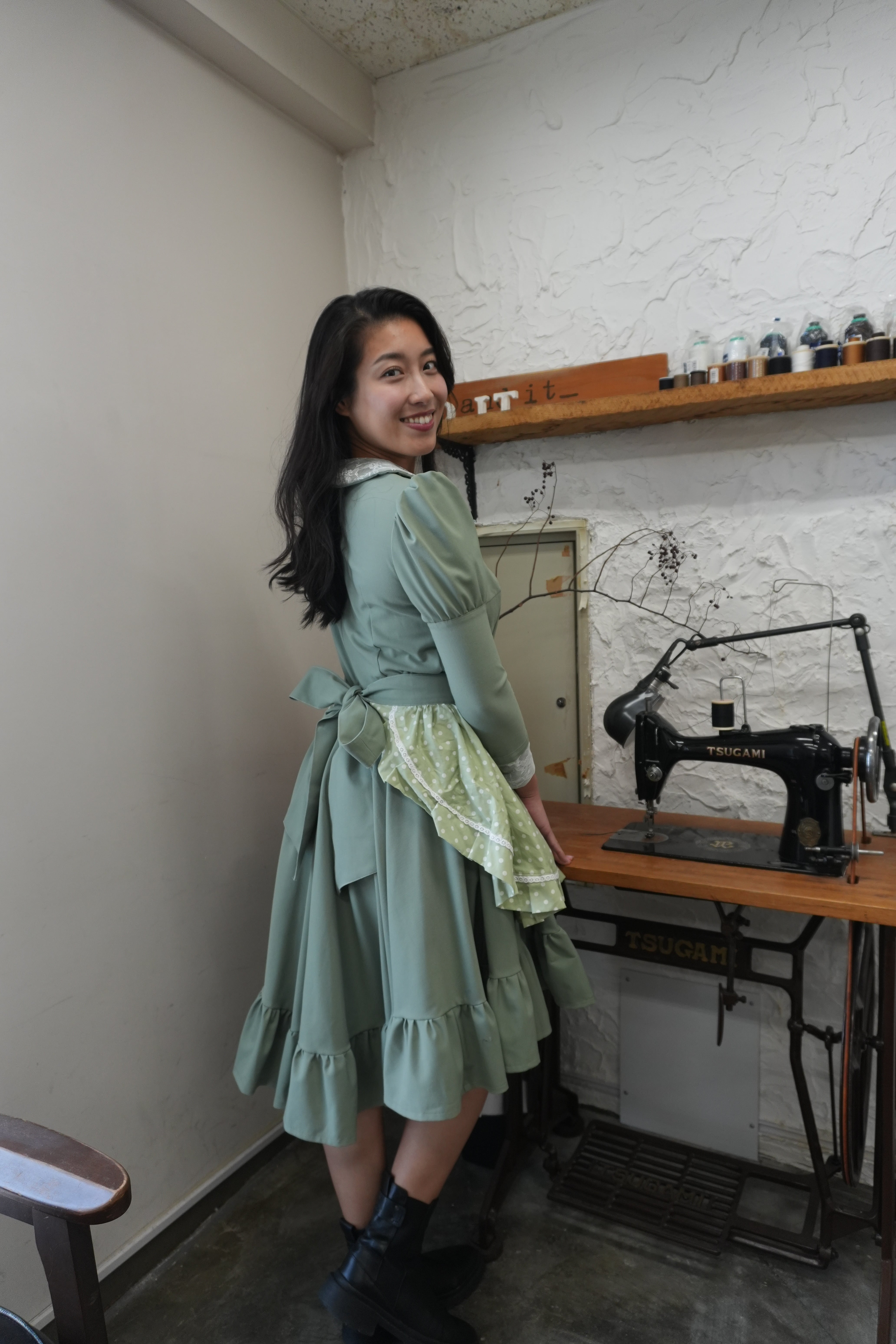 Design: 絶妙なピスタチオカラーが目を引く、ハイウエスト切り替えのドレスです。胸元のクラシカルなボタンと、ふんわりとしたパフスリーブが女性らしさを際立たせます。