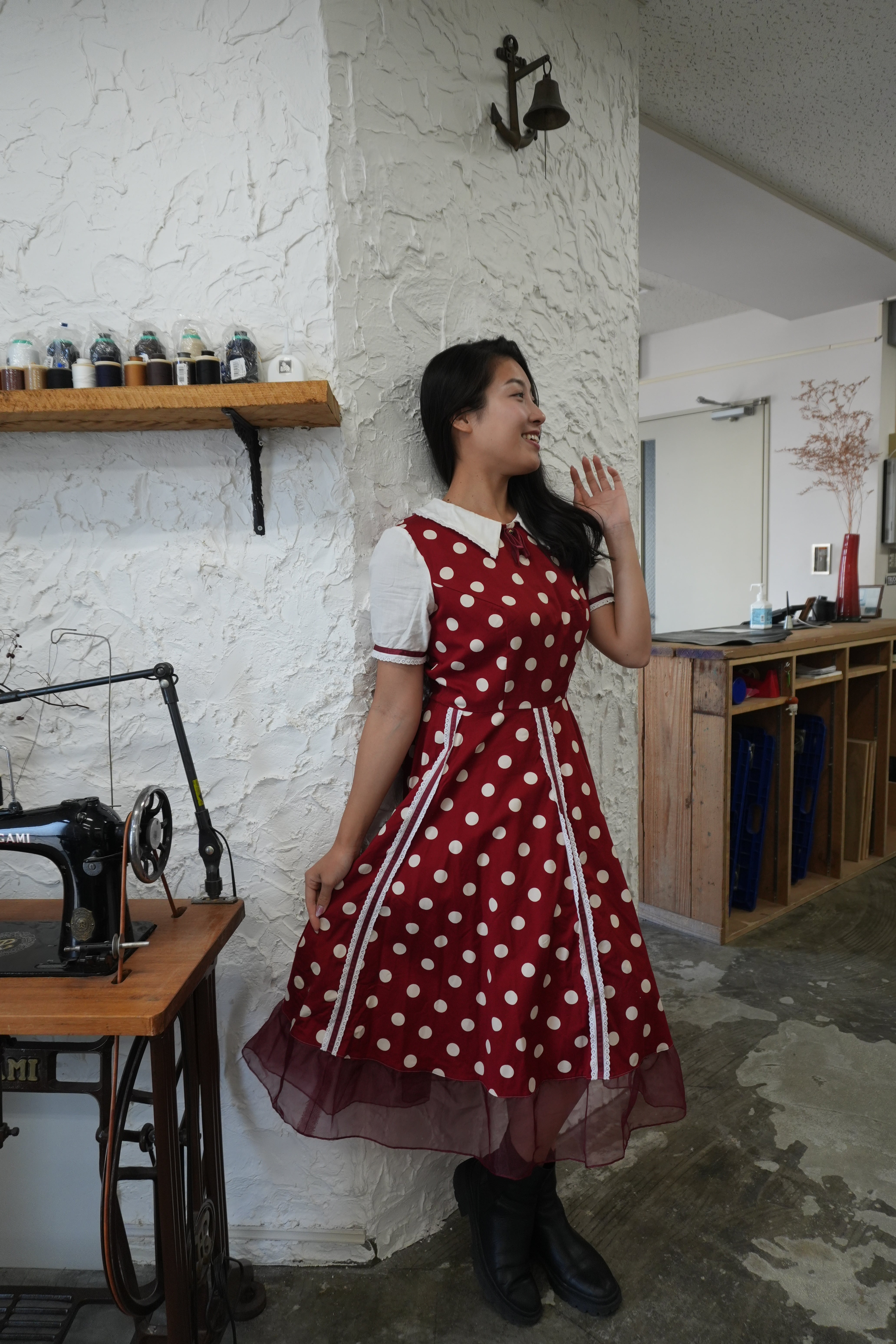 赤ドット×白襟のドーリーワンピ(裾シアーフリル)
