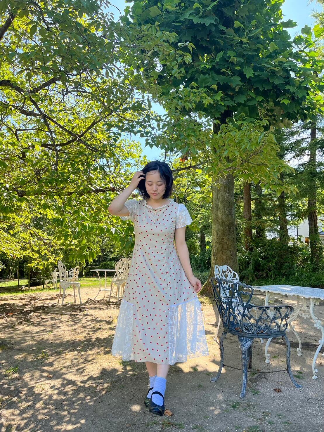 赤ドット×白レースのドーリーワンピ