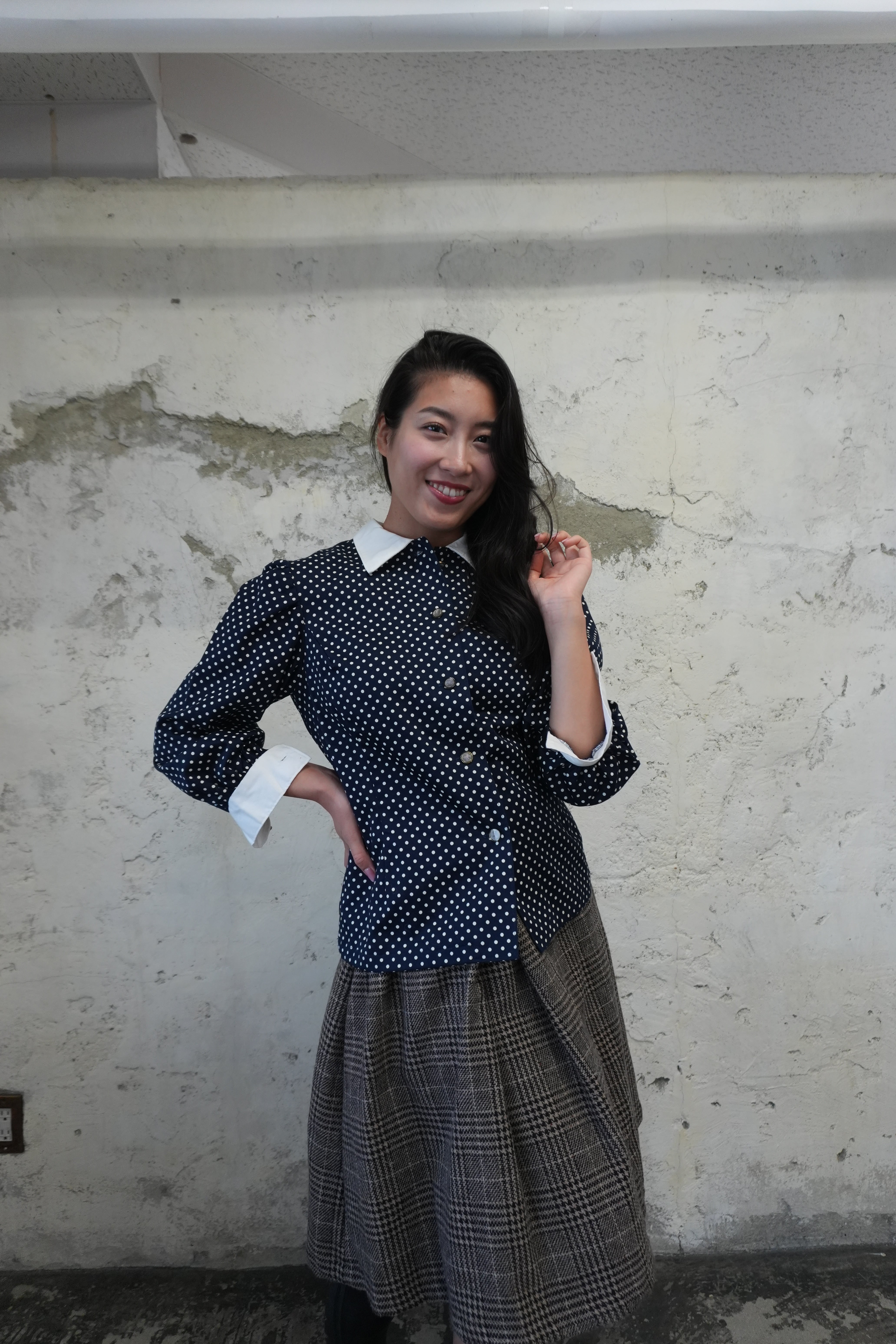 Design: 知的なネイビーに、等間隔に並んだ白いドットが映えるヴィンテージライクなシャツです。